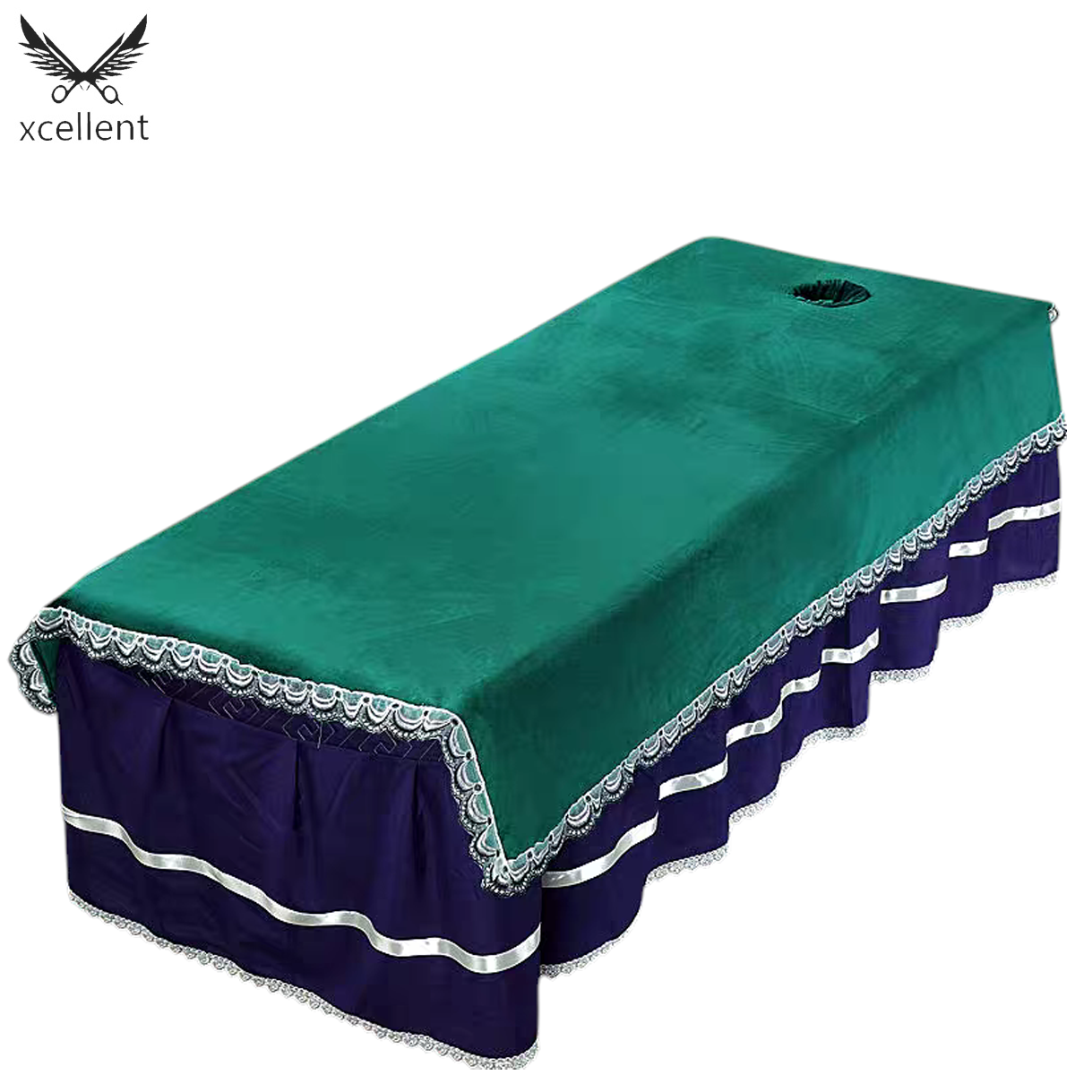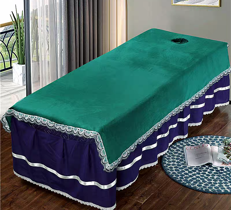 花边蕾丝洞单厚床罩采用高品质加厚面料,柔软舒适、透气耐用。清新绿色搭配精致蕾丝花边设计,营造舒适自然的护理氛围。中间预留洞口设计,方便美容、按摩及SPA操作,实用美观兼具。